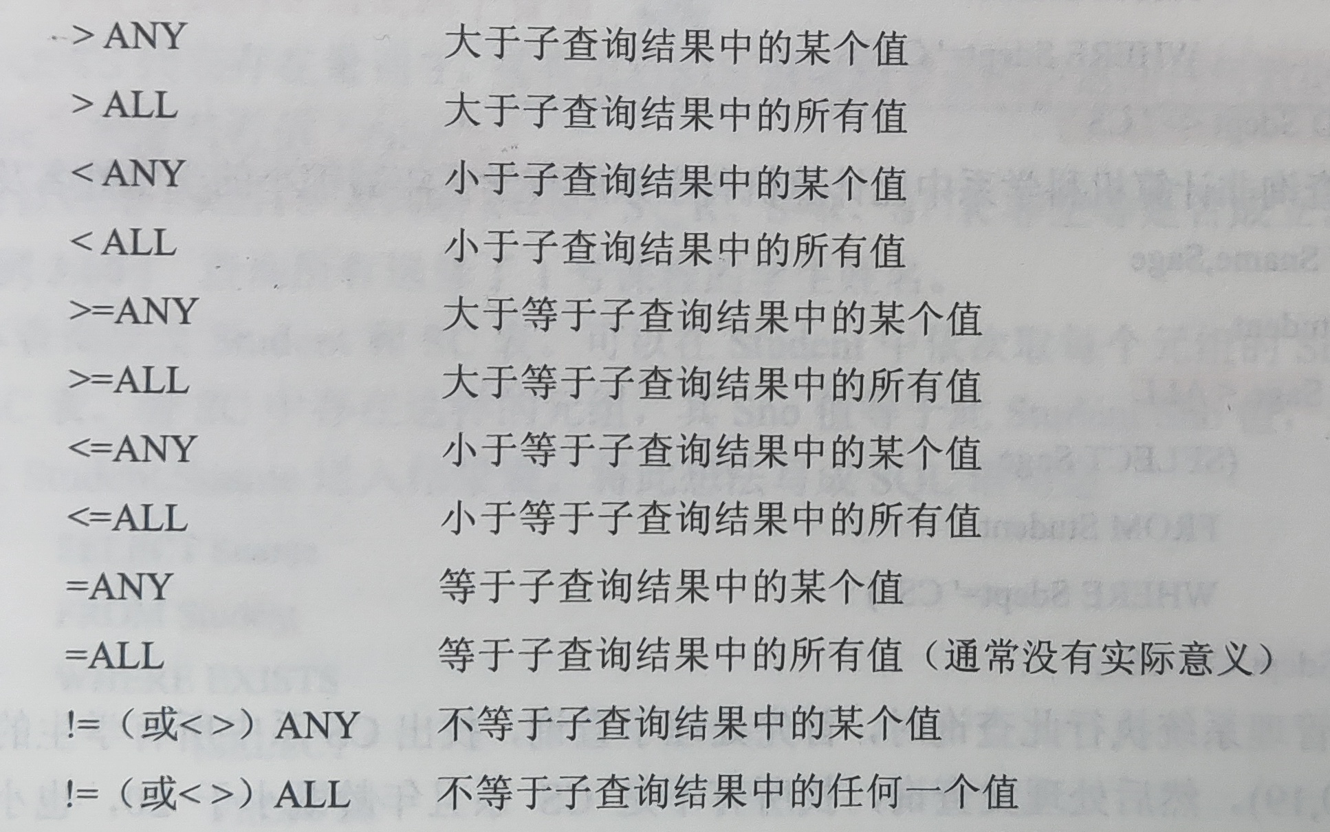 若子查询返回集合,且需要进行比较查询,便可以使用 any 和 all 。其中, any 指任意, all 指所有。