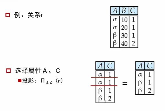 若进行投影后出现重复的元组,需要进行删除。