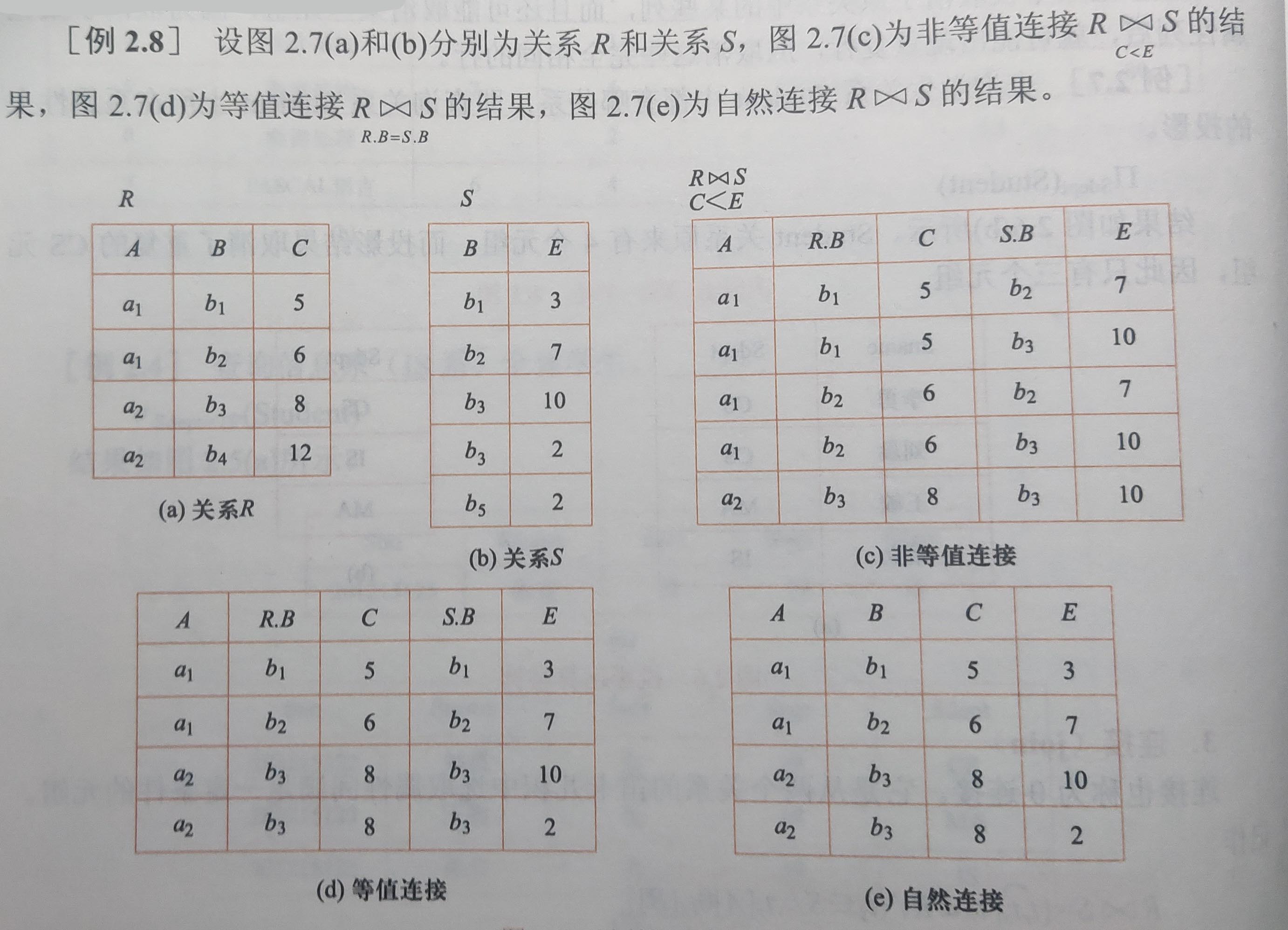 θ 为 = 的连接运算(A = B),即等值连接。从关系 R 和 S 的笛卡儿积中选取 A、B 属性值相等的元组。