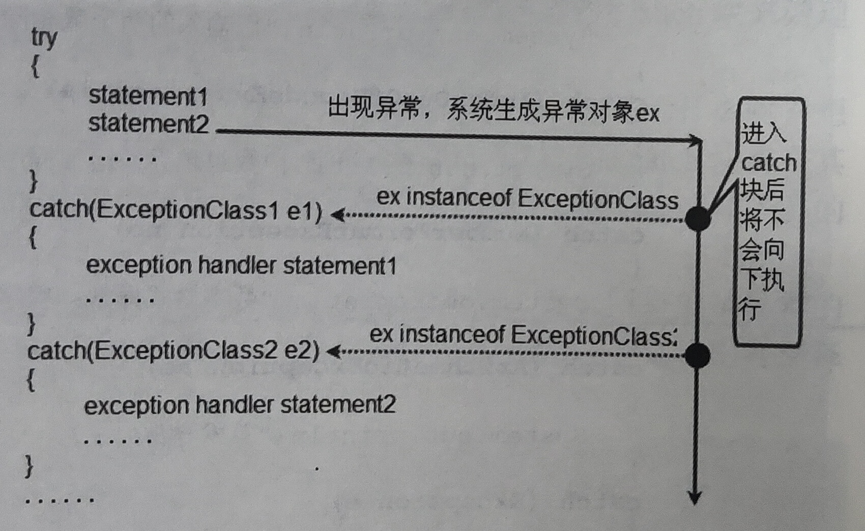 • 进入 catch 块后,方法中的剩余代码都将不会被执行,并且其它 catch 块也不会被执行